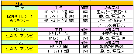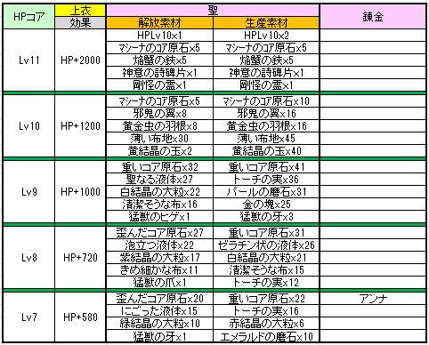201607/10 HPコア コア 0 錬金のリストも載せましたが、HPコアはまずLv7以上しか使わないかと思います。 特別強化レシピで作ってみましたが素材の消費の割に数が出来ず割に合わないと思いました。 そのまま普通にLv7作った方が良かった(;・∀・) [0回]PR