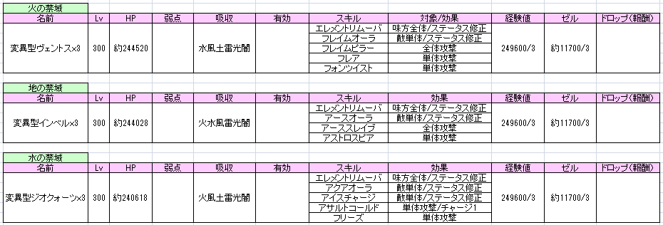 エネミーに関しては有効とかスキルの詳細等都度更新項目が多いと思うので画像にせず、後で文章に直していきます。
