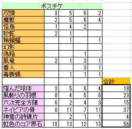 そしてその時に6000コイン分回したボスチケでどのくらいのレア素材が集まるのか検証した結果が以下のようになりました。