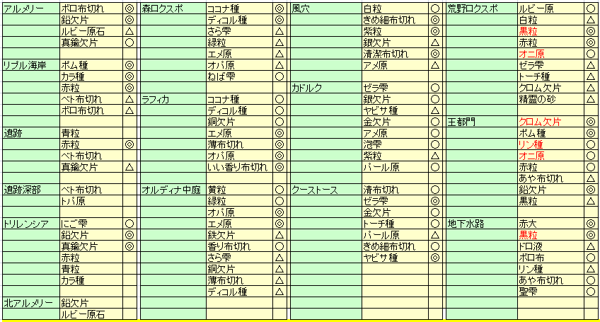 序盤(アルメリー~北アルメリー)の辺りは湧き場と呼べるような場所がなく、十分な戦闘回数をこなすのがキツくてドロップ率は未記入となっています。